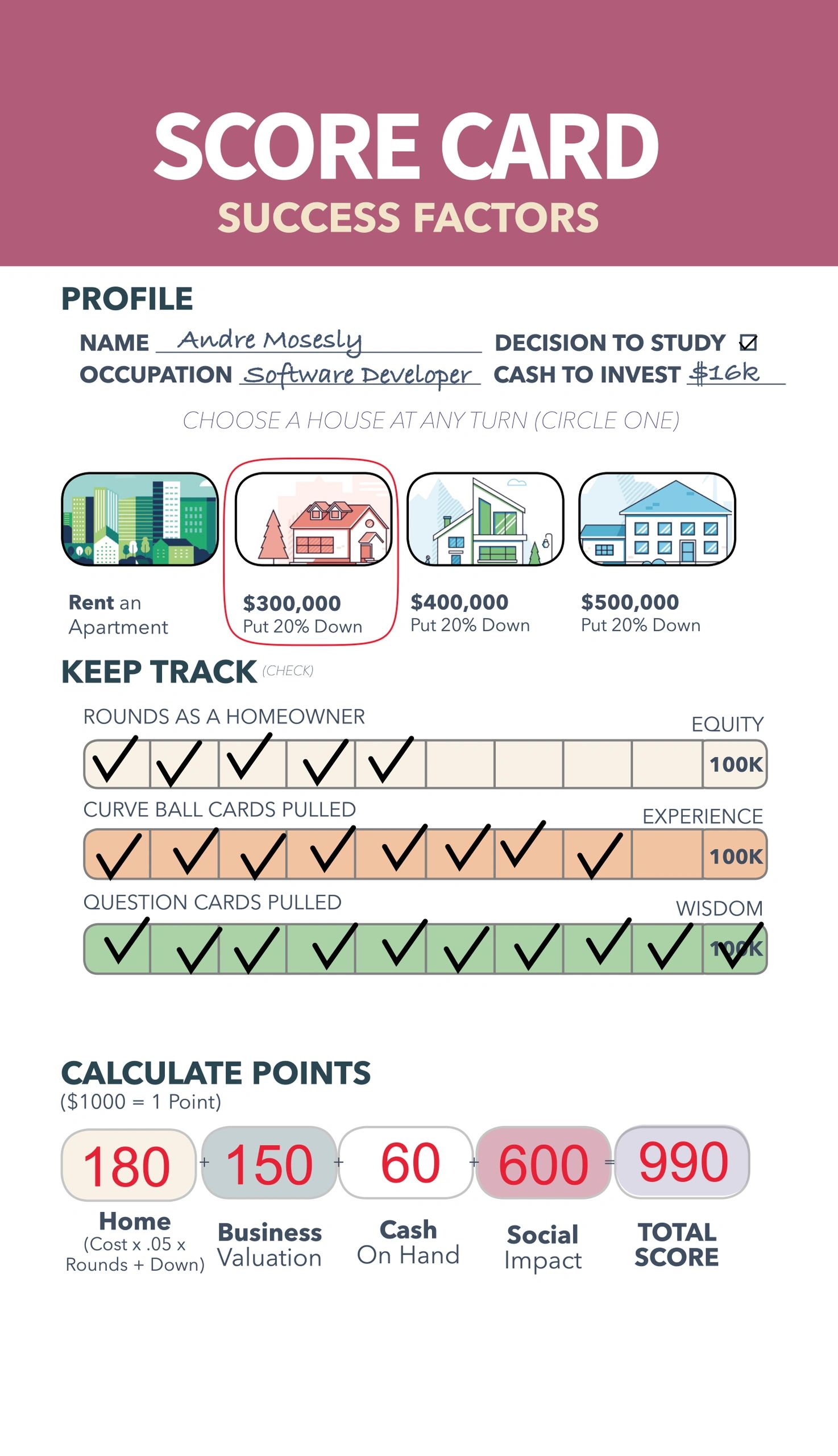 Each player receives a scorecard to track additional points during the game. Players write their “Disposable Income” from their career card on the “Cash to Invest” sections.